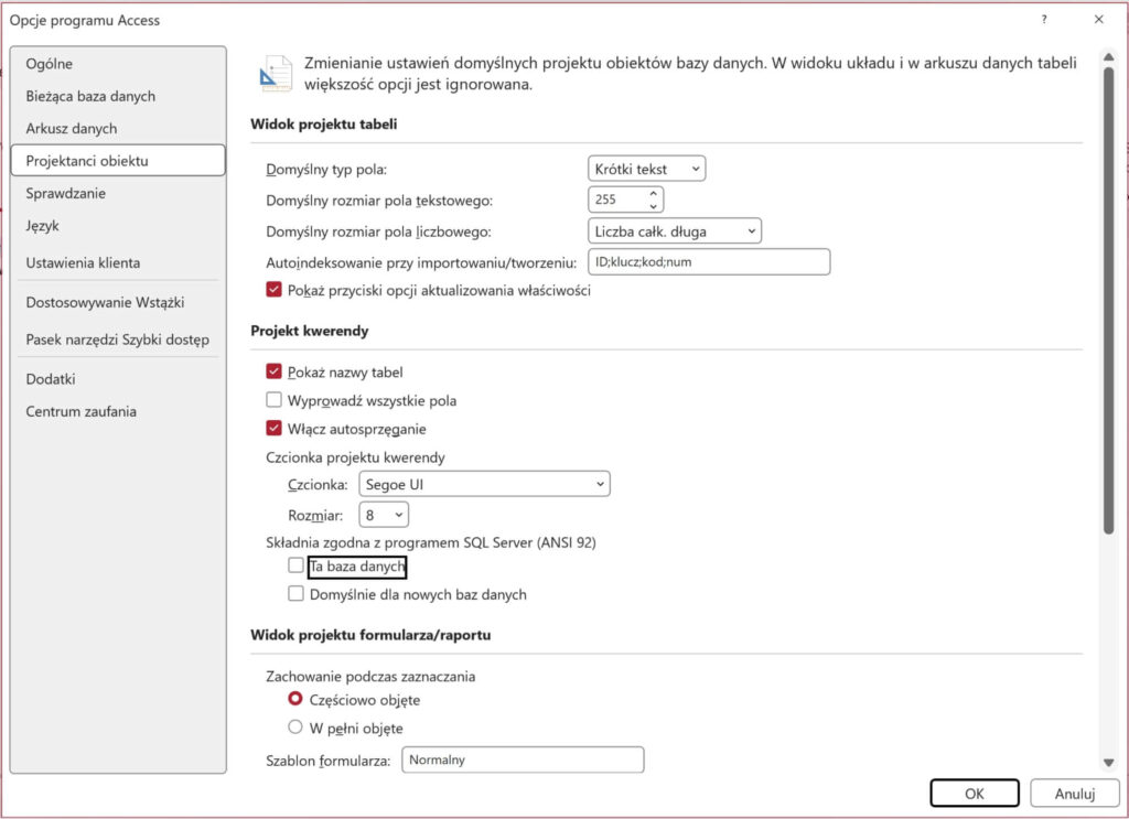 Wystarczy kliknąć opcje zaznaczone na powyższym obrazku, żeby utworzony kwerenda wykorzystywała składnię ANSI SQL.
